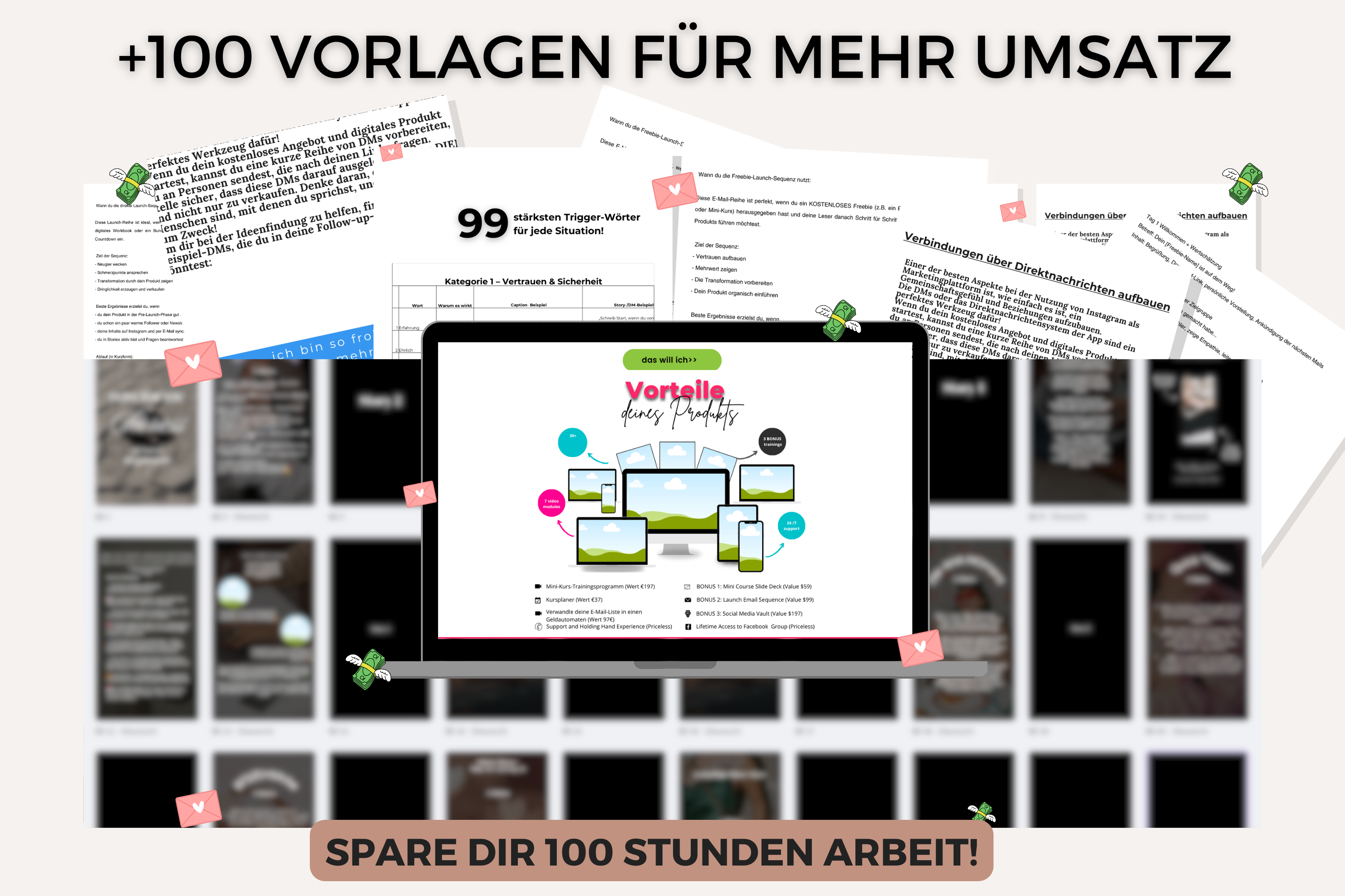 In deinem bestellten Kurs lernst du ein erprobtes System, das du direkt für dich anwenden kannst. Wenn du zusätzlich über 100 Stunden Zeit bei der Content-Erstellung sparen möchtest, sind diese Vorlagen die perfekte Ergänzung für dich: